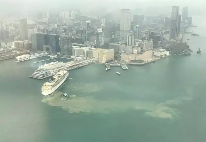 從相中可見,一艘郵輪正駛進尖沙嘴海運碼頭準備靠泊,由高空所見,船尾底部有「啡色污水」蔓延擴散數百米,有網友猜測是廢水、油污或泥,甚至認為是「屎水」。