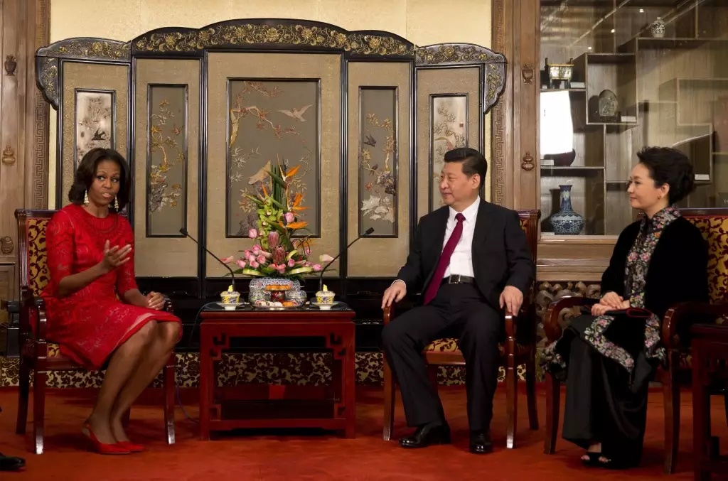 2014年3月21日,彭麗媛陪同美國第一夫人米歇爾·奧巴馬游覽故宮。彭麗媛一身藍色毛呢套裙,紅色襯衣,英氣逼人。此套毛呢外套與去年3月出訪俄羅斯時實為同款,頗受外界好評。