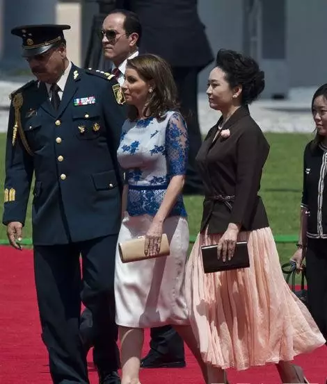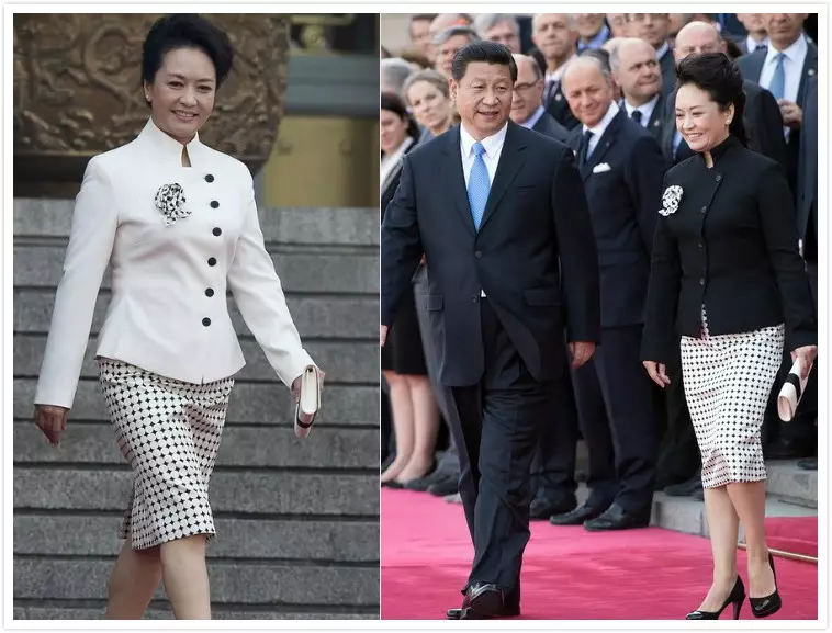 2013年8月26日,塞爾維亞總統訪華的歡迎儀式上,彭麗媛身穿的白色套裝搭配棋盤式過膝裙亮相,大氣優雅,細節處更是透出濃濃的中式韻味。4個月前,彭麗媛亦穿同件過膝裙在北京歡迎法國總統奧朗德與其女友,只不過外套換做了黑色。