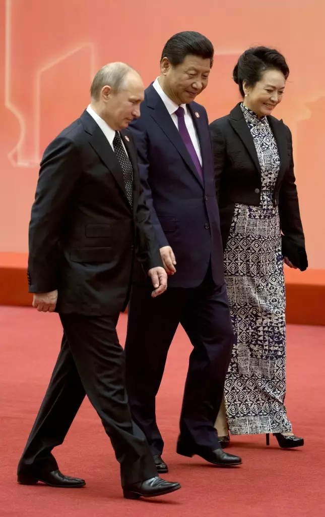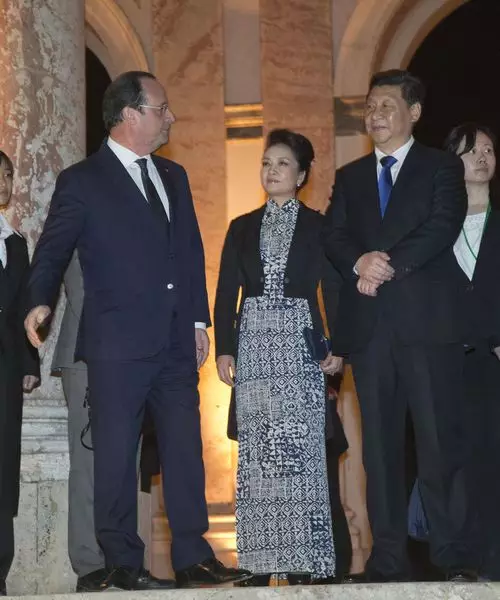 2014年5月20日,中国国家主席习近平携彭麗媛在亚信峰会上迎接俄羅斯總統普京。彭麗媛身著一件青花瓷改良式旗袍加設計獨特的長短式外套優雅現身,而這套衣服彭麗媛早在3月陪同習近平出訪法國時就已穿過。法國總理奧朗德在愛麗舍宮設豪華國宴款待習近平夫婦。
