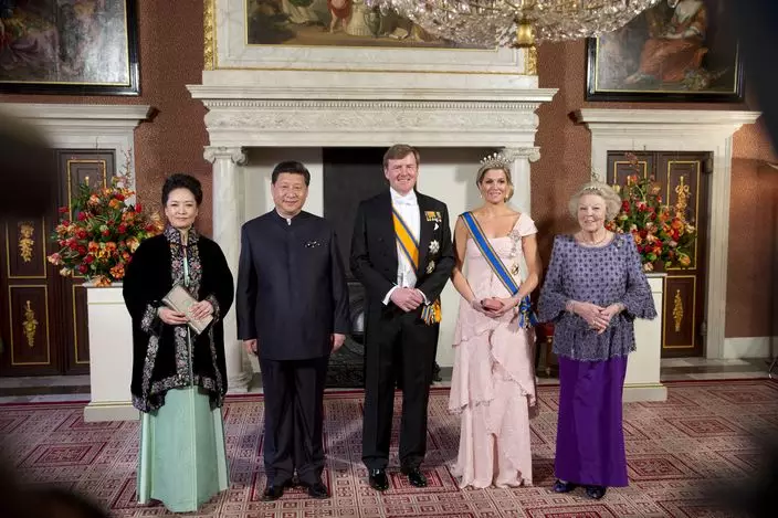 東方元素是彭式Style中的精髓。彭麗媛擅長利用盤扣、刺繡、絲綢等元素襯托出其淡雅溫婉的東方韻味。今年3月,彭麗媛陪同習近平去到荷蘭會晤荷蘭國王和王后,以一身中國風刺繡斗篷式外套亮相,端莊大氣。而這件別緻的外套並不陌生,在美國第一夫人米歇爾的中國之行中,彭麗媛就曾經穿過,但襯了不同顏色的長裙。