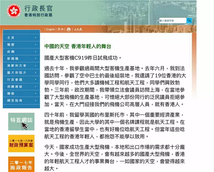 毛拍手看到C919試飛成功的新聞,和朋友議論那一個香港政客會有反應,毛拍手估計是特首梁振英,結果真是估中了,他在facebook上專門發了文章,題為「中國的天空 香港年輕人的舞台」。