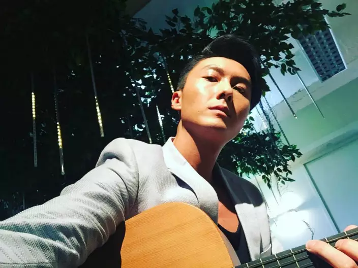除了練肌肉,曾是歌手的他也為《不懂撒嬌的女人》練結他,拍攝自彈自唱情歌的場面(王浩信FB圖片)