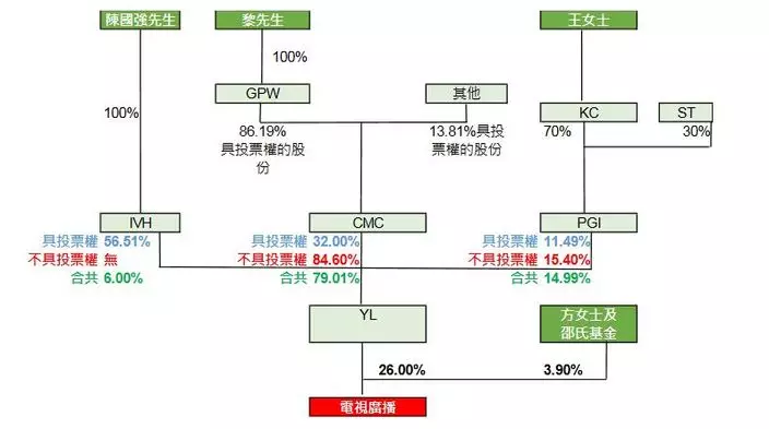 收購合併委會員公開的文件披露TVB大股東YL的股權架構,TVB副主席黎瑞剛旗下的CMC持有YL具投票權股份的32%,主席陳國強持有具投票權股份的52.51%,但連同不具投票權的股份,CMC共持YL 79.01%股份。換言之,陳國強雖擁有YL過半數投票權股份,但由於CMC對委任TVB董事擁有最大影響力,陳國強無法控制YL董事會投票結果。而黎瑞剛則持有CMC 86.19%具投票權股份,間接持有TVB 20.5%股份。