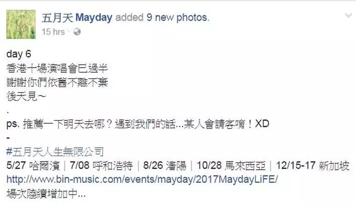 台灣天團五月天履行「五月之約」,來港開10場紅館騷,根據以往經驗,五子都會趁休息日出外當遊客。今日(18日)就是演唱會休息日,五月天官方專頁就搞笑請粉絲推薦地方遊玩,寫明「遇到我們的話……某人會請客唷!」一向是下靶位的鼓手冠佑慘被團員陷害,紛紛出賣冠佑的行蹤。