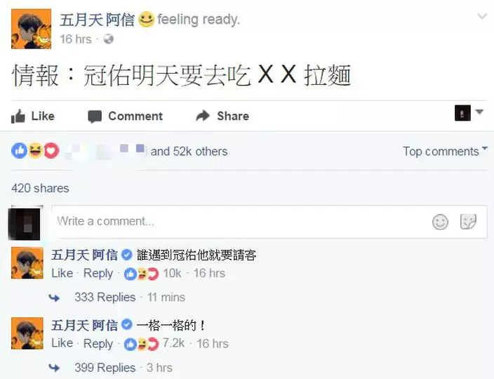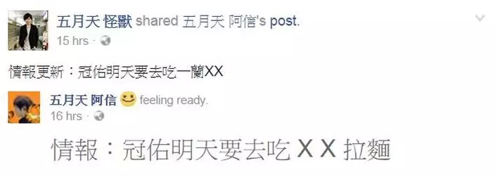 主唱阿信先在社交平台爆料:「冠佑明天要去吃XX拉麵。」怪獸又轉發阿信貼文:「冠佑明天要去吃一蘭XX。」結他手石頭都聯手出賣好友,留言:「冠佑住在我的樓下,隨時告訴你們他去哪!」