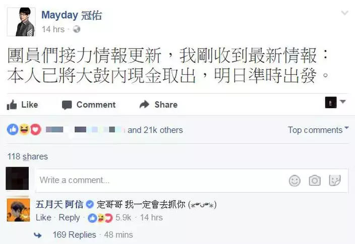 無奈的冠佑最後亦有發文:「團員們接力更新,我剛收到最新情報,本人已將大鼓內現金取出,明日準時出發。」不知道冠佑最後會否被捕獲呢?