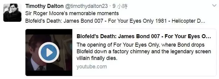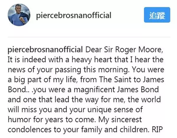 英國傳奇影星、「占士邦」羅渣摩亞(Roger Moore)前日於瑞士因癌症去世,享年89歲,同樣曾演過占士邦的辛康納利(Sean Connery)、鐵摩達頓(Timothy Dalton)、皮雅斯布士南(Pierce Brosnan)和丹尼爾基格(Daniel Craig),及眾多影星都於社交網站留言悼念。