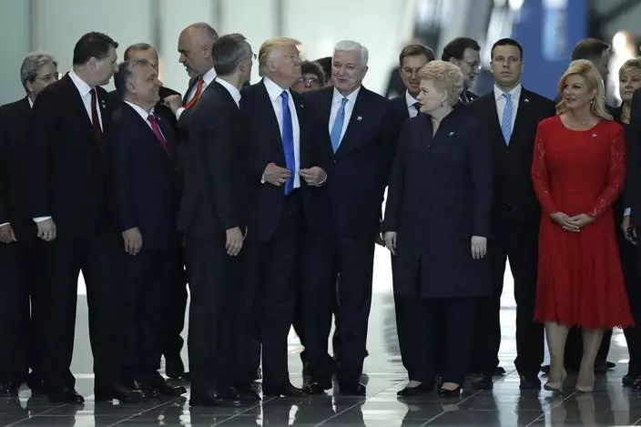 特朗普從後推開黑山總理馬科維奇(右二)。(AP圖片)