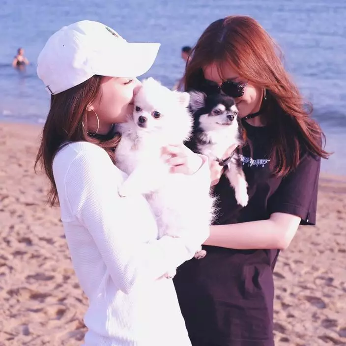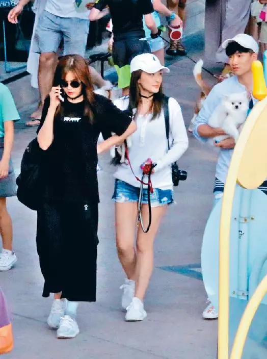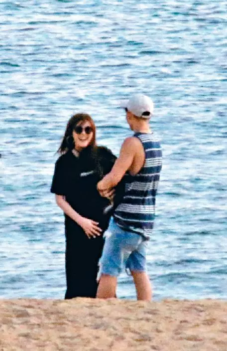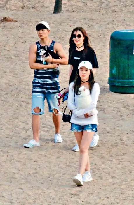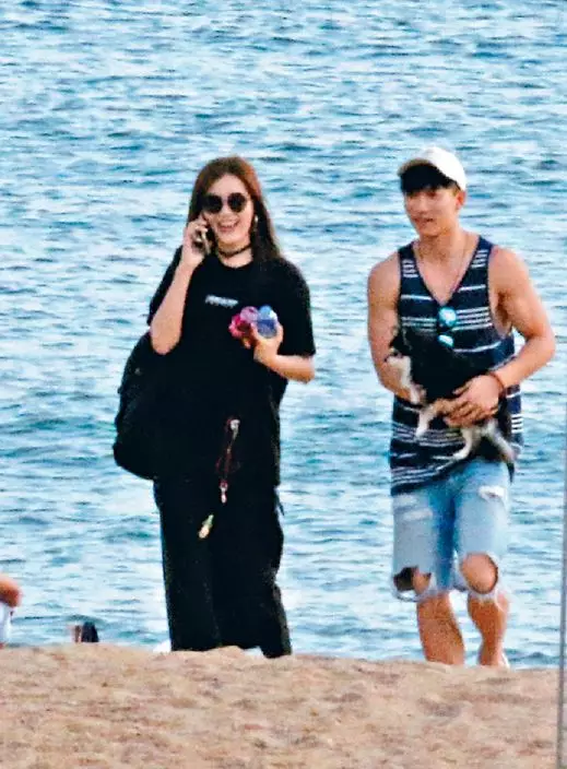 可見Moon步速好正常,完全不覺她有腳傷,行到沙灘,一直悶悶不樂的阿Moon回復笑容,還行兩步就踢下沙,又同大孖笑,還攝影大師上身,不斷幫抱住陳瀅愛犬的大孖影沙龍。
