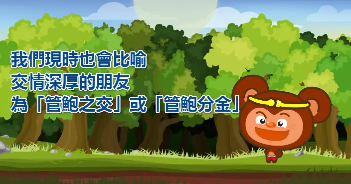 鮑叔牙這名朋友,處處為管仲設想,就算他的才能高於自己,也不會妒忌。管仲與鮑叔牙一起經歷許多事,當鮑叔牙去世時,管仲非常悲痛,哭著說:「生我的是父母,知我的是鮑叔牙啊!」這個故事告訴我們,有人能默默幫助自己,又或者雪中送炭,那可會讓人銘記一輩子。管仲和鮑叔牙相知最深,我們現時也會比喻交情深厚的朋友為「管鮑之交」或「管鮑分金」。