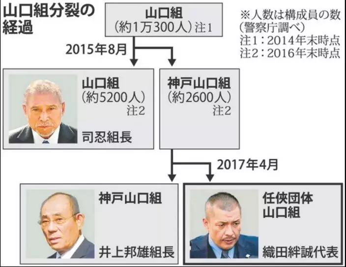 山健組是山口組旗下最有勢力的次級團體之一,不過以名古屋為根據地的「弘道會」組長司忍接手山口組六代目組長後,山健組不滿司忍將幫派重心移往名古屋,山口組原來的主流次級幫派於是在神戶「自立門戶」。司忍認為手下「有異心」便企圖剷除異己,13名山口組的直系幹部擁護井上邦雄,2015年8月成立「神戶山口組」,勢力更不斷壯大。