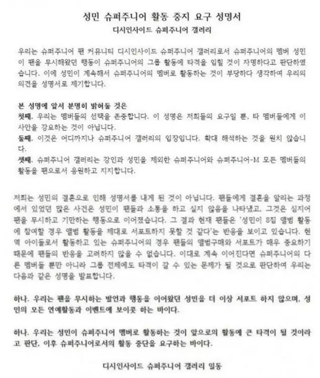 後援站在聲明中強調這只是後援站的個人立場,隨後又列舉出晟敏在SJ第七張專輯活動期間爆出戀愛消息,使組合宣傳遭重挫,粉絲希望聽到晟敏的親自回應,就在Blog下私信留言,但卻遭晟敏刪除,並在「要離開就離開,要留下就留下」的留言下按讚,令粉絲十分失望。