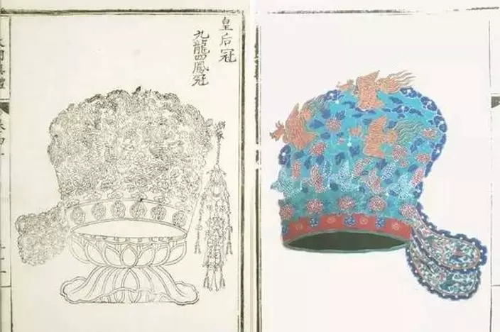 值得一提的是,李皇后的鳳冠與明代十三陵定陵出土的皇后鳳冠有相似之處。1956年,考古人只挖掘北京十三陵明代萬曆皇帝定陵,出土了一批服飾實物,其中就有孝靖皇后所用的鳳冠。這頂鳳冠以竹絲為骨,編為圓框,框內外各糊一層羅紗,然後在外表綴以金絲、翠羽做成的龍鳳,周圍鑲嵌各式珠花。在冠頂正中的龍口,還銜有一顆寶珠,左右二龍及所有鳳嘴均銜下一柱珠串。
