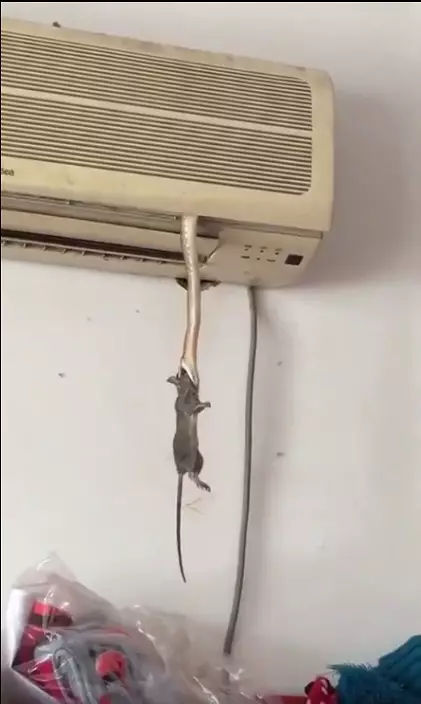 影片只得10秒,一開始就見到一條蛇尾部在冷氣機之內,倒吊半空叼住一隻手掌般大的死老鼠。憑肉眼估計蛇應該都有近一米長,牠咬住死老鼠慢慢退回到冷氣機內。網民看完影片都表示相當驚訝,覺得好恐怖,又好奇那條蛇是怎樣鑽進冷氣機內,亦有人質疑影片是否造假。