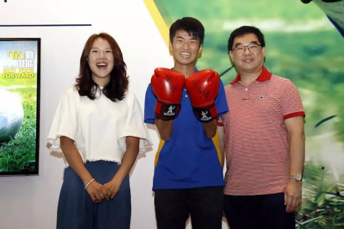 陳震愿(中)奪得學員領袖獎,並獲贈曹星如的簽名拳套。