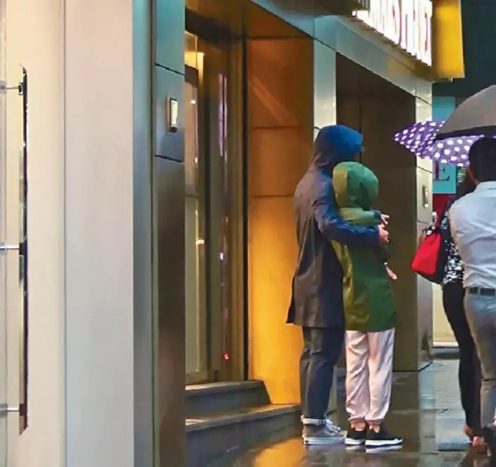 林海峰攬實同穿上防水褸嘅孻女林清,冒雨行入商場。