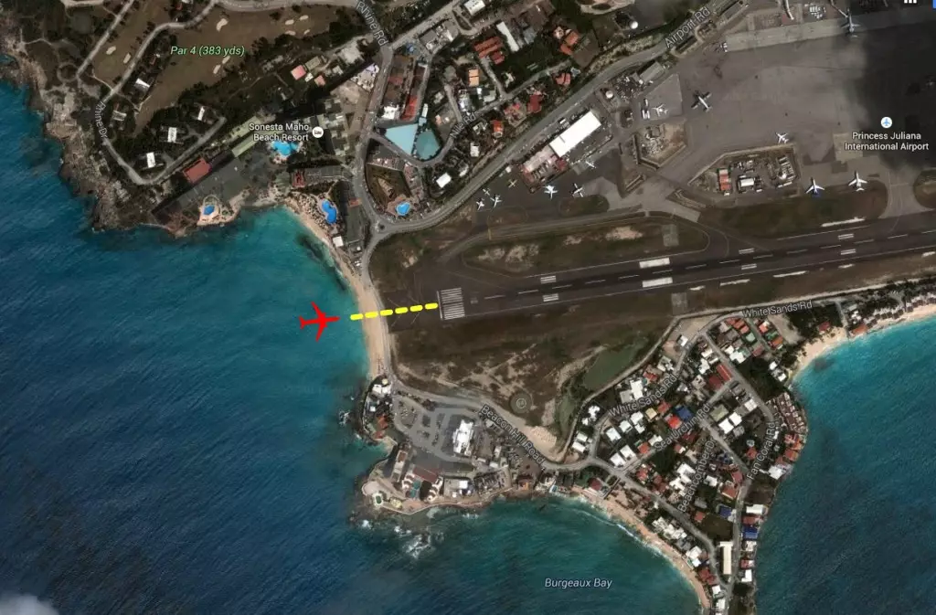 朱麗安娜公主國際機場降落,除對旅客刺激,對機師而言亦不可出錯,因為跑道前就是海。(Google Map)