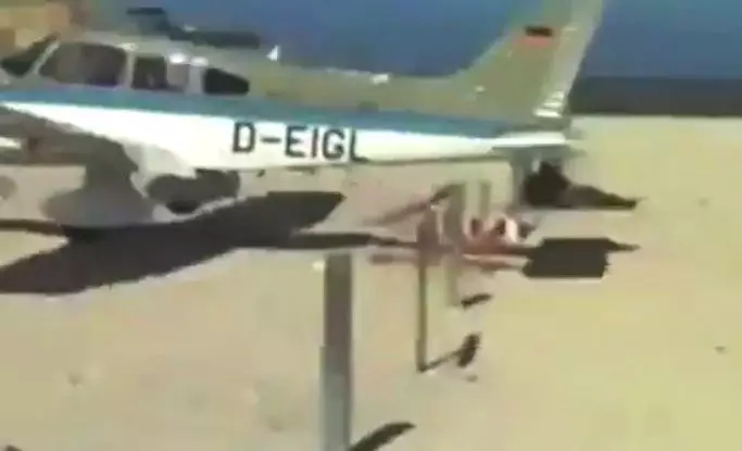 夏日炎炎,正好「同陽光玩遊戲」,不過要小心,可能會被飛機剃頭。在德國北部小島Helgoland-Dune一架Piper PA-28-181 Archer II小型飛機在小島降落時,因為判斷錯誤,差幾吋就撞倒正享受日光浴的男人,之後撞過圍欄,然後才進入跑道。