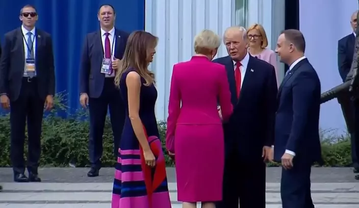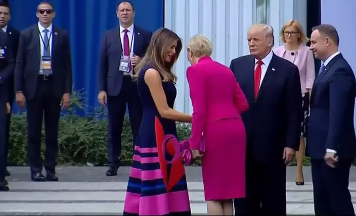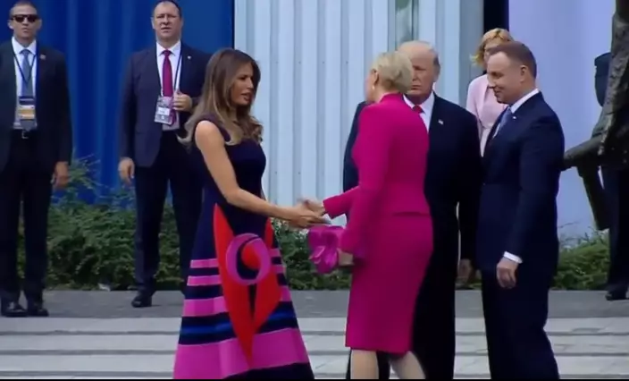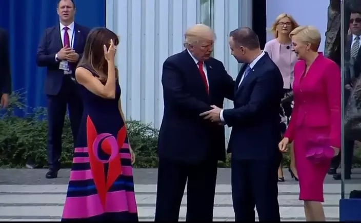 特朗普昨日在波蘭首都華沙的克拉辛斯基廣場(Krasinski Square)發表演說,與陪同的波蘭總統杜達和夫人阿格塔(Agata Kornhauser-Duda)一同合照,隨後四人便各自展開握手,只見特朗普自信地將手伸向阿格塔,對方居然直接略過走向梅蘭妮亞,同梅蘭妮亞握手,完全無視他的存在。