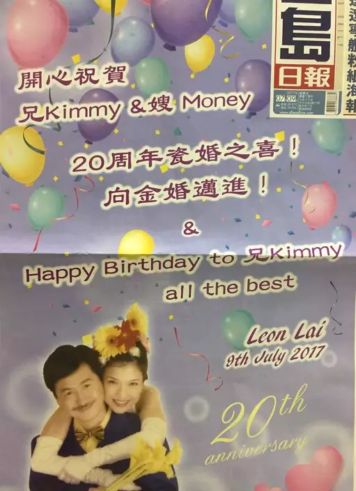 天王黎明今天在報紙頭版登賀稿祝福孫敬安(Kimmy)和盧敏儀(Money)結婚20周年,而夫婦兩人事前全不知情,十分驚喜。