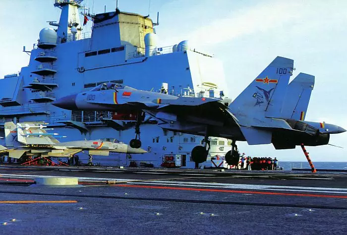 遼寧艦一共有4道攔阻索,均勻排列在甲板後部,其中任何一條都可以勾住飛機,在中國第二艘航母001A上,攔阻索減少到三條。
