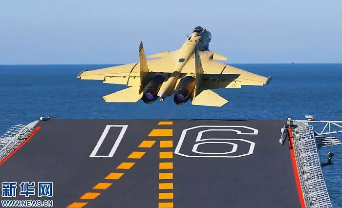 殲-15訓練機準備起飛,後面的擋焰板已經揚起