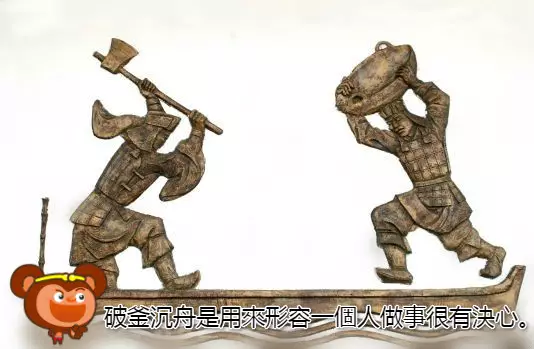 項羽的軍隊勢如破竹,在攻至鉅鹿時,為了令軍隊視死如歸,吩咐士兵們在渡江後,鑿沉了小舟,打破了用來煮食的器具(當時稱為釜),只留下了三日的乾糧。最後在鉅鹿一戰,大破秦軍主力,秦國這個時候可謂非常之危隊。日後大家會用破釜沉舟這句成語,去形容很有決心去做一件事的意思。