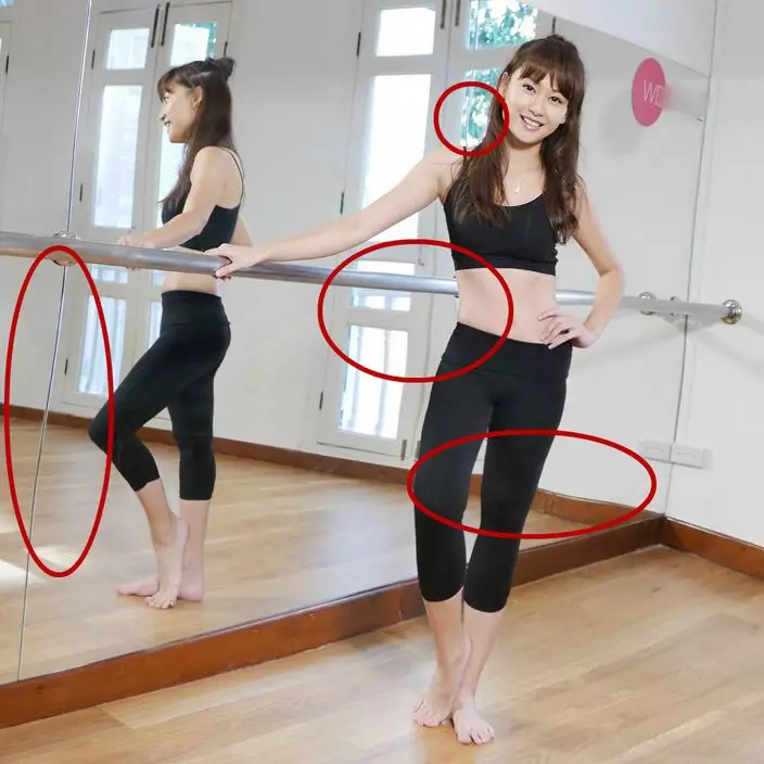 照片中的子珊穿上黑色運動小背心,大騷23吋小蠻腰,但背後的鏡卻出賣了她。可見鏡變得彎彎曲曲,子珊身後的門窗更直接變形,明顯過度修圖。