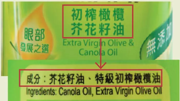 但因為這項規定,卻發現不少調和油名字都很取巧,例如配料表「芥花籽油、葵花籽油和大豆油」排在較前,「初榨橄欖油、花生油、葡萄籽油、藻油和亞麻籽油」則排在較後位置,顯示芥花籽油、葵花籽油和大豆油佔產品重量的比重應該較大,不過產品名稱卻以「初榨橄欖」或「葡萄」為名稱的開首。