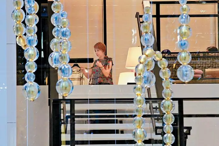 店員為利嘉兒試戴頸鏈,幫她襯出不同的戴法。