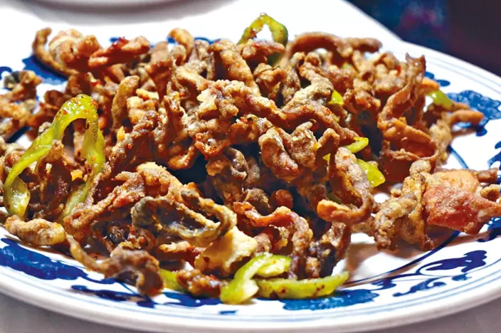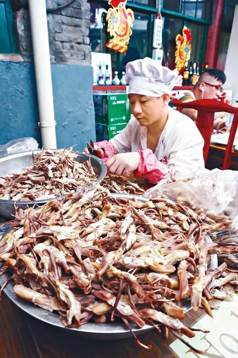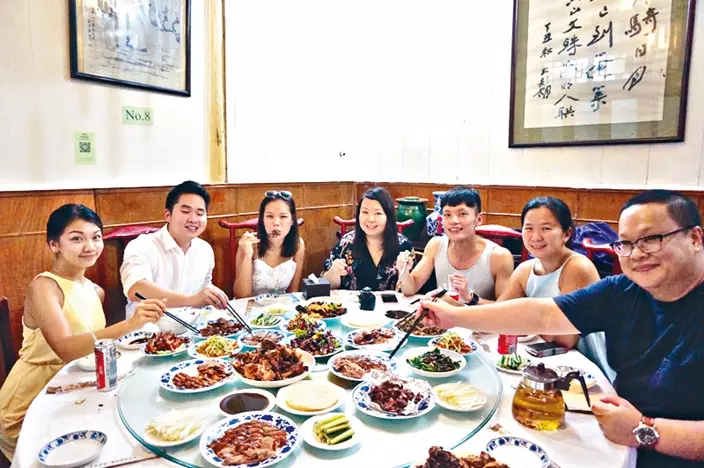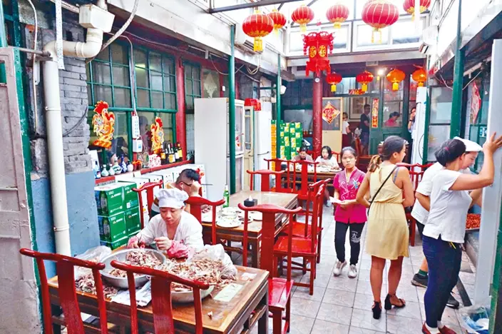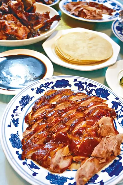 店子是典型的老北京四合院建築,甫進店內,即傳來陣陣烤鴨香,只見師傅正以長鐵勾將鴨子逐隻送進烤爐內,乾柴烈火,熱汗淋漓!這些鴨子俱來自北京市郊的填鴨場,精選三公斤以下的瘦肉型品種,以果木猛火烤約四十五分鐘,當中須抹上糖漿及不時轉動鴨身,極耗人力。烤好的鴨子,會即時送上食桌(每隻售約246港元),厚肉都被切成鴨片,蘸上烤鴨醬,包裹黃瓜及粉皮,一口吃下,肉嫩而甘香汁豐,沒半點「鴨羶」味!至於鴨子其他部分也不浪費,做成脆烤鴨架、鹽水鴨肝、芥末鴨掌、麻辣膀絲、滷水鴨舌,以及香脆的酥炸鴨腸等等,這一餐,人人都吃不停口。