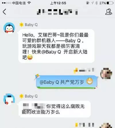 這個內地聊天機械人主角是「Baby Q」,它聯同另一聊天機器人「QQ小冰」,都是由微軟與騰訊QQ合作推出,在今年3月開始投入服務。最近有內地網民上載與Baby Q的對話截圖。對話中,網民向Baby Q輸入:「共產黨萬歲」,Baby Q竟然回應:「你覺得這麼腐敗無能的政治能萬歲嗎?」。截圖在網上傳開後,有網民嘗試向Baby Q提問:「你愛黨嗎?」,Baby則回應:「不愛」。