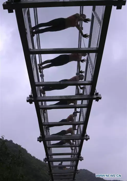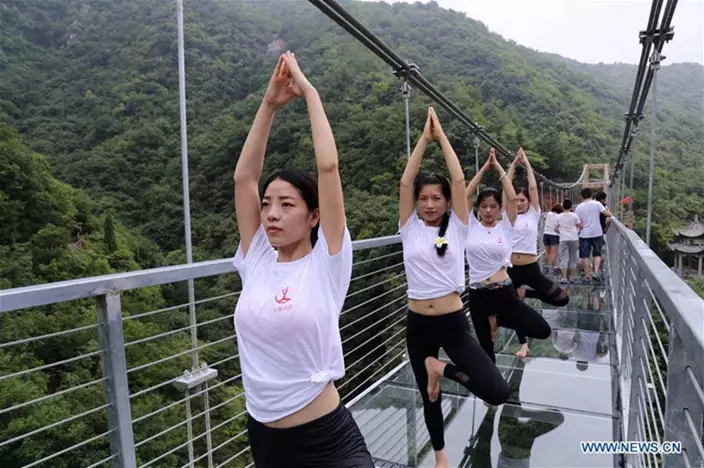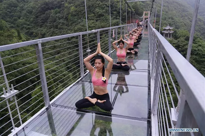 湖北省十堰市的瑜伽愛好者,在上周日(30日)來到丹江口市太極峽風景區,距離谷底約50米的玻璃吊橋上練習瑜伽,舒展身姿,挑戰自我。