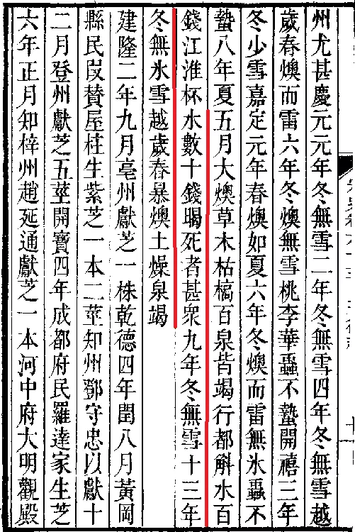 在公元1400年以前,高溫熱浪天氣涉及範圍最大的一次,發生於南宋的嘉定八年(公元1215年)。當時的皇帝是寧宗趙擴,當時受熱災波及的範圍,是今天的河南、安徽、江蘇、湖南等省份,加上這年又恰逢大旱,災情嚴重。《宋史·五行志》上有這樣的記載:「五月大燠,草木枯槁,百泉皆竭。」「燠」的本意是溫暖,史書上稱「大燠」就即「太熱」。因為對水的需求過於旺盛:「行都斛水百錢,江、淮杯水數十錢」,一杯水都要錢,那時老百姓定沒能力買得起,於是「暍(渴) 死者甚眾」。