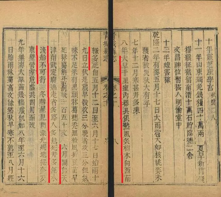 至於中國歷史上最熱的夏天,並非於南宋嘉定年,是出現於清代乾隆八年,即公元1743年。在2013年出版的《中國三千年氣象記錄總集》中,看到這年高溫幾乎涉及半個中國-北京、天津、河北、山西、山東等整個華北地區異常炎熱,是超級酷暑。有關乾隆八年極端炎熱記錄,在所涉地的史誌上,包括《續東華錄》、《續天津縣志》等均有記錄,當中《青城縣志》 記載了山東高青的慘況:「大旱千里,室內器具俱熱,風炙樹木向西南輒多死......六月間,自天津南武定府逃走者多,路人多熱死。井多無水淺,船不可行。」