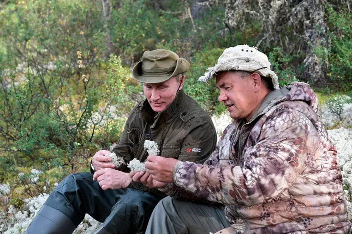 In this photo released by Kremlin press service on Saturday, Aug. 5, 2017, Russian President Vladimir Putin, left, and Defense Minister Sergei Shoigu rest during a mini-break in the Siberian Tyva region, a few days ago. (Alexei Nikolsky, Sputnik, Kremlin Pool Photo via AP)
