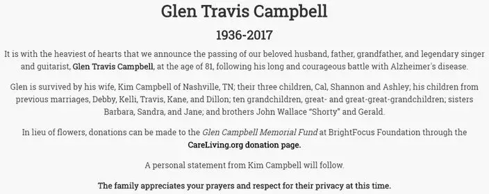 Glen的家人在其官方網發表聲明表示:「我們以最沉重的心情宣佈,我們最愛的丈夫、父親、祖父、傳奇歌手和吉他手Glen Campbell,經過漫長時間,勇敢地與腦退化症搏鬥後離世,享壽81歲。」