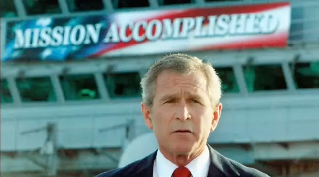 小布殊的智商據說只有91(低於100低於常人),但勝在行動大膽,就在2003年3月動手,基於一些叛離伊拉克人士不太可靠的證詞,話伊拉克總統候賽因發展「大殺傷力武器」(Weapon of Mass Destruction),聯同多國部隊,就此發動對伊拉克的戰爭。結果在一輪轟炸後,開戰三星期後攻入伊拉克首都巴格達,開戰兩個月後到2003年5月,小布殊就在航空母艦林肯號上,在《任務完成》的大橫額前,宣布勝利。這亦成為經典的一幕,因為要到7年後,到2010年8月,戰爭才真正結束。