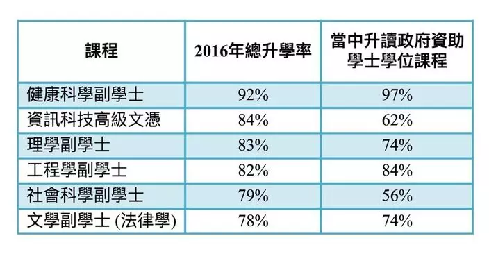 目前所有副學土課程每年學生人數接近兩萬人,而本地8間大學銜接課程的學位就有4500個,意即讀完兩年副學士後,有4500名學生可直接升讀本地大學3、4年級的津助學位課程。