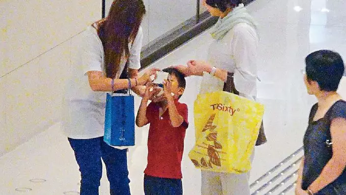 日前下午,著得好悠閒的家蔚湊黐身大仔洪大仁(TJ)和奶奶行圓方。三婆孫閒逛成個鐘,買了幾袋戰利品就入超市。四歲的TJ似足父母生得好高大,而且好孝順不時拖實媽媽或嫲嫲。婆媳二人貼頭選乳酪、火腿、牛奶等,買東西有商有量。而TJ會模仿大人選購,又爭着推購物車。其間,高麗虹突然「mood到」,停下與新抱訓話,而家蔚亦非常尊重奶奶,收起笑臉雙手放背後,似足學生咁乖聽「訓導主任」說教。