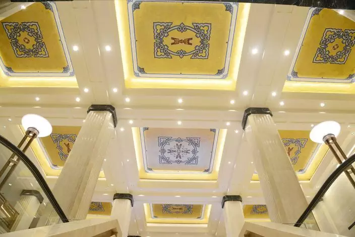貝禮中成功還原當年以威尼斯金色馬賽克砌成中國錢幣圖案的天花板設計,現時當客戶進入中銀私銀總部大堂,抬頭仰望,便能一睹這昔日華麗的設計。中銀私銀董事總經理曾錦燕指,天花板圖案設計中的錢幣有些古字,原來都有出處,意思為金、銀、財通等,該行就找來古字專家協助解構。