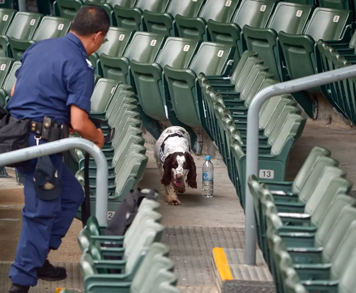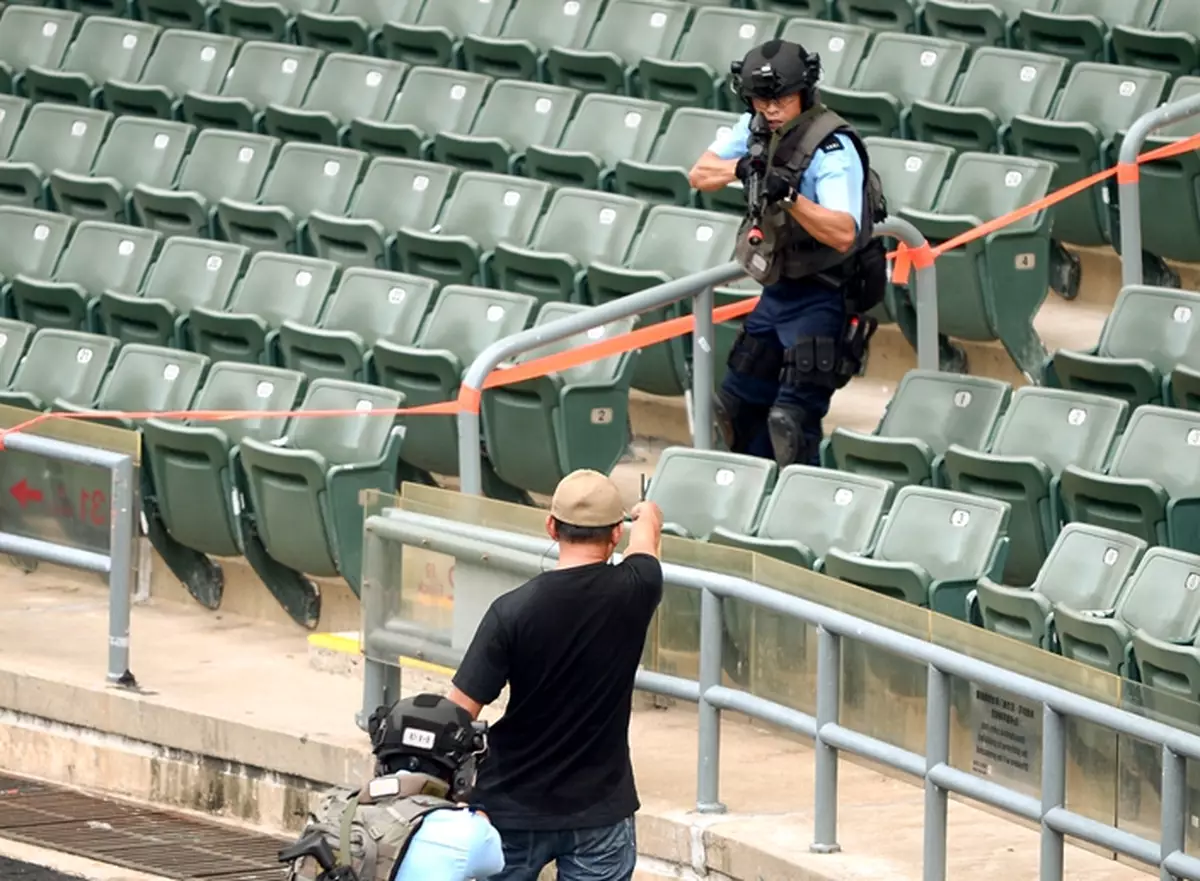針對近期國際恐怖分子襲擊大型表演場地,警方昨在大球場進行「實地」反恐演練。演習模擬三名恐怖分子,昨午趁跑馬地大球場舉行大型演唱會期間,引爆看台下炸彈,並持刀追斬觀眾,造成多人死傷,警方反恐特勤隊進駐迅速疏散觀眾。