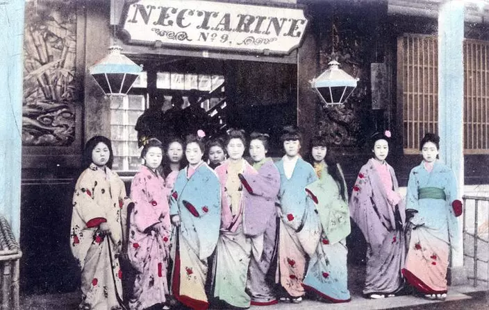 這批相片在1890至1900年代拍攝,出處不明。據了解,在此營生的,大多是來自農村的窮家女。一般因為家人債台高築慘遭賣落妓寨,最年輕的只有7歲。要是幸運遇上賞識她們的人,她們可能獲培訓茶道等禮儀,充當名妓的侍女,但大部分都淪落至低級妓寨,等待有人為她們「贖身」納為妻妾。也有妓女能儲夠錢為自己贖身。