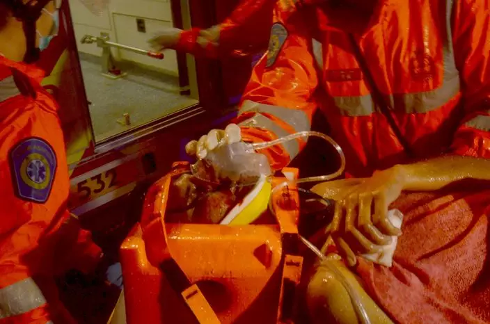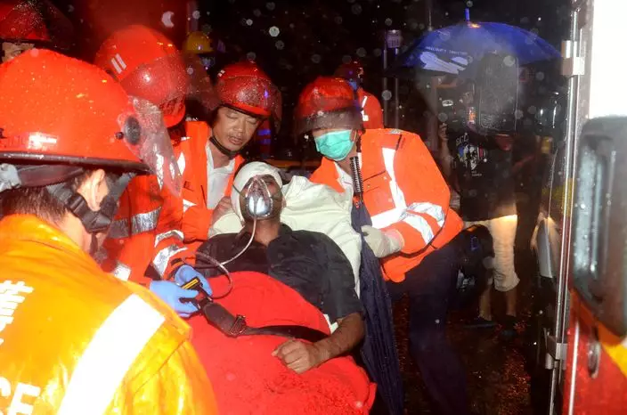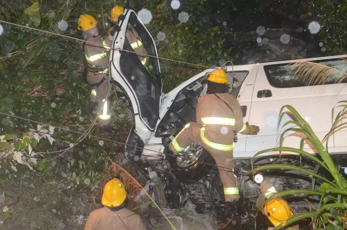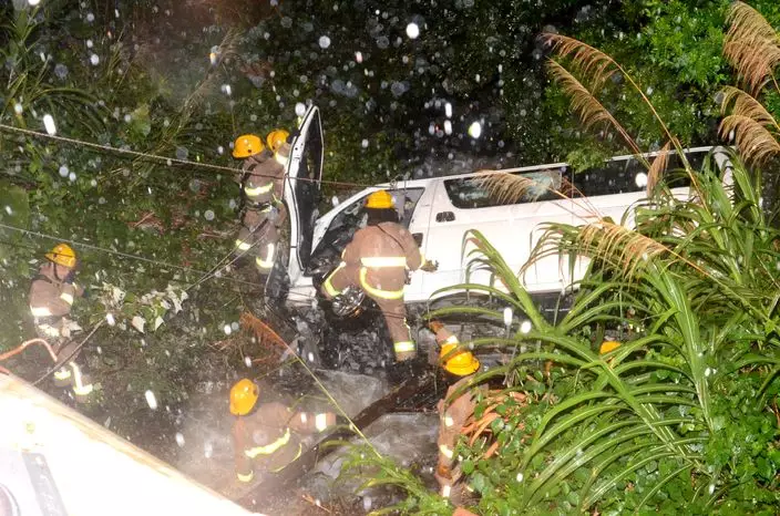 冒雨遊車河的十名巴籍男女,昨凌晨超載客貨車失事衝落引水道,險被淹死,消防員到場拯救,其中一女乘客腳部夾著困在車內一小時,恐被洪水沖走一直面露恐懼神色,最後安全獲救。