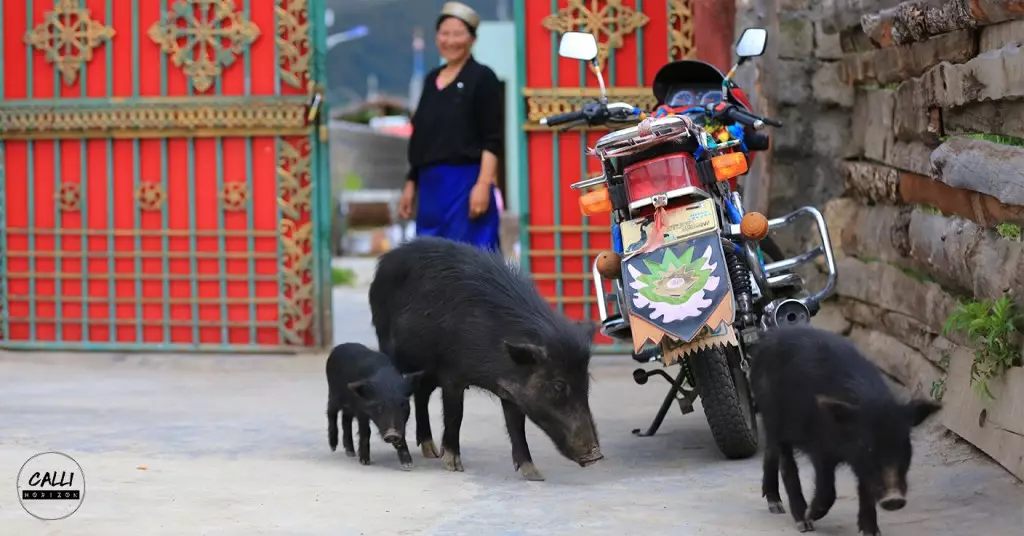 在林芝地區,較常看到的是黑色的藏香豬,這種豬隻身型不大,是川西高原獨有的古老品種,牧人也是以養牛羊方式飼養牠們,每天帶牠們出去散步遍山走,每天日落之時,幾隻至幾十隻不等的香豬會自行漫步回家,整齊地列在家門前等候主人開門入屋,旁邊還有頸上掛有響鈴的牛隻,與豬叫聲混在一起,成為藏區獨有的「鈴聲」。