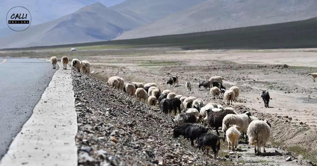 牛和羊是藏牧人的重要財產,每天放牧也成了他們最重要的事。走在路上,不時會發現遍山牛羊,有的一小撮毛會被染成藍色、紅色,方便主人記認,再仔細一看會發現牠們品種各異,經過時聽咩咩聲叫法,很是搞笑。