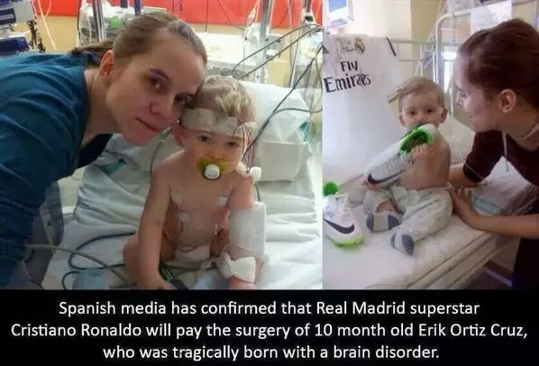 互聯網最近狂傳指C朗捐助5萬英鎊 (折合約65萬港元)讓西班牙10個月大男童Erik Ortiz Cruz在二月做手術,治療先天腦部疾病。C朗「閃電頭」被指與男童手術後疤痕一樣。C朗所屬球會未有證實或否認傳聞,而事實上C朗亦絕少評論自己做過的善事。