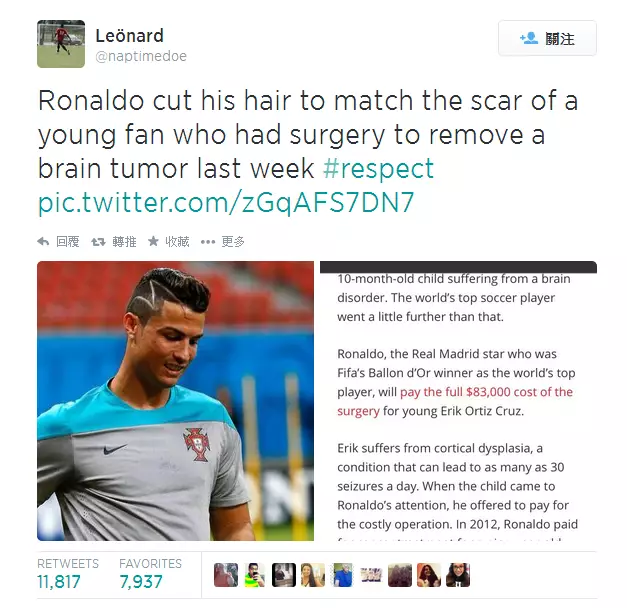 世界盃葡萄牙對戰美國戰前,C朗換了新髮型,剃了像閃電的「反Z字」。作為球星大家可能以為是最新潮流時尚指標,但網上瘋傳消息指,是這位世界足球先生為西班牙患病兒童致敬的舉動,外國傳媒亦有爭相報道。