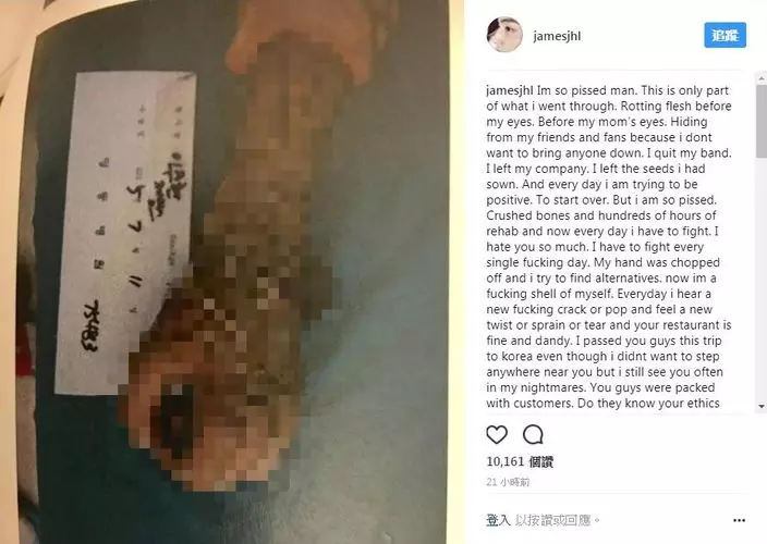 2013年出道韓國樂隊Royal Pirates由三位韓裔美籍成員組成,包括29歲的James、Moon和27歲的洙尹。當中James在兩年前因意外導致左手腕嚴重受傷,今年初退出樂隊努力治療,可惜最終都要截肢。他在社交網站激動留言:「我每天都嘗試保持正面、重新來過,但我真的很生氣!」